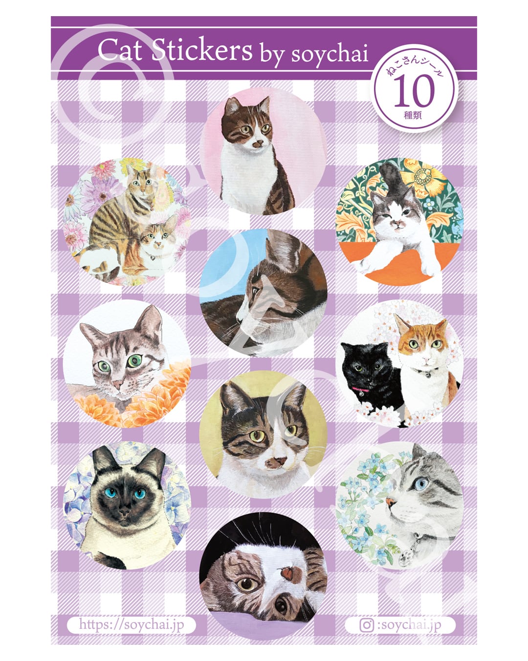 こちらの「ねこさんシール【紫】」は「うちの子絵画」で描かせていただいた猫さんの絵6種類+soychaiの愛猫だんごくんの絵4種類の、合計10種類の円形シールです。